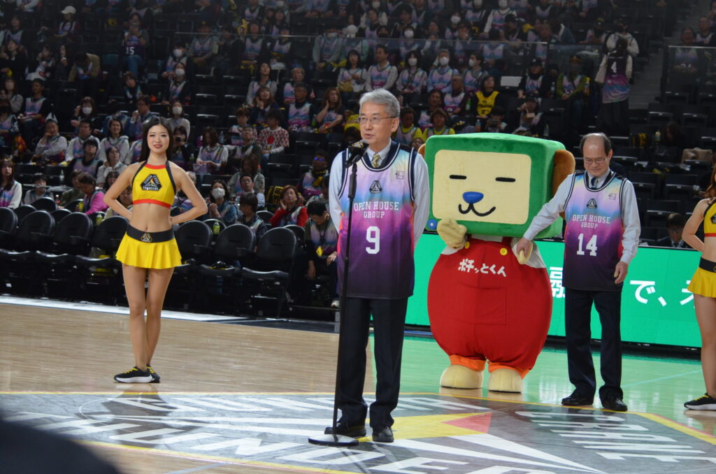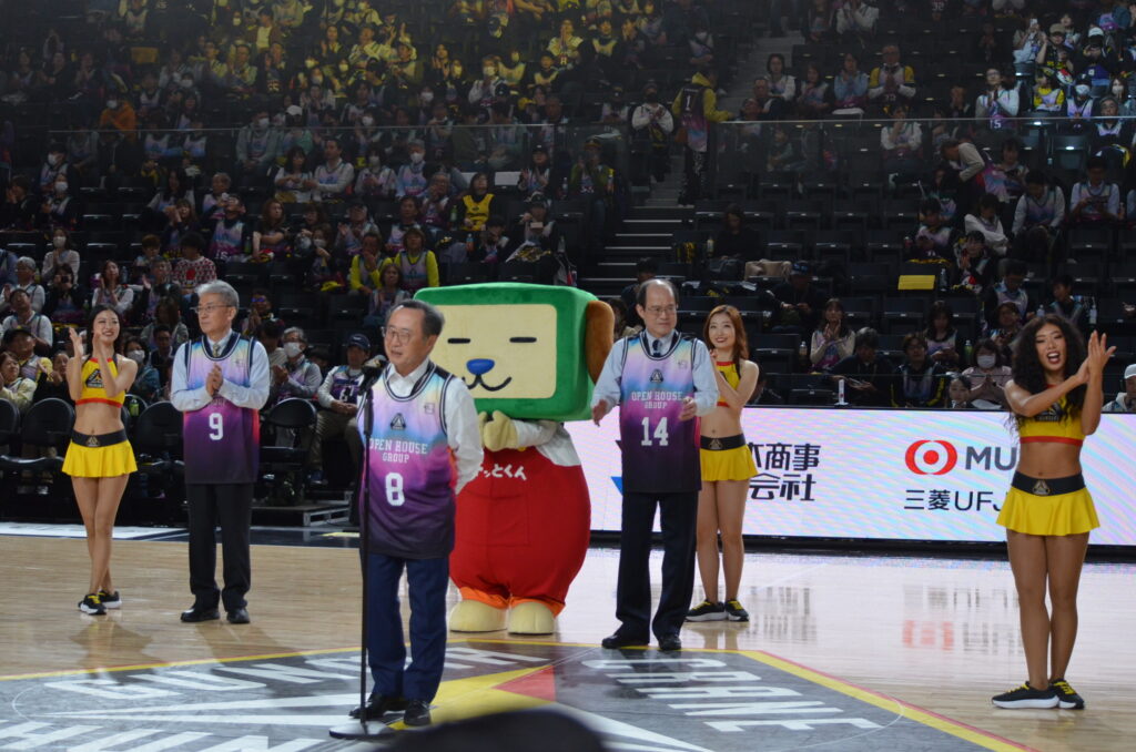 試合開始前、群馬県内の主要メディアである上毛新聞社、群馬テレビ、エフエム群馬の社長3名がコートに登壇。超満員のブースターを前に、チャンピオンシップ(CS)進出を狙うサンダーズへ、そして遠路駆けつけたアルティーリ千葉のファンへ向けて、三者三様の温かくも力強いメッセージが送られました。