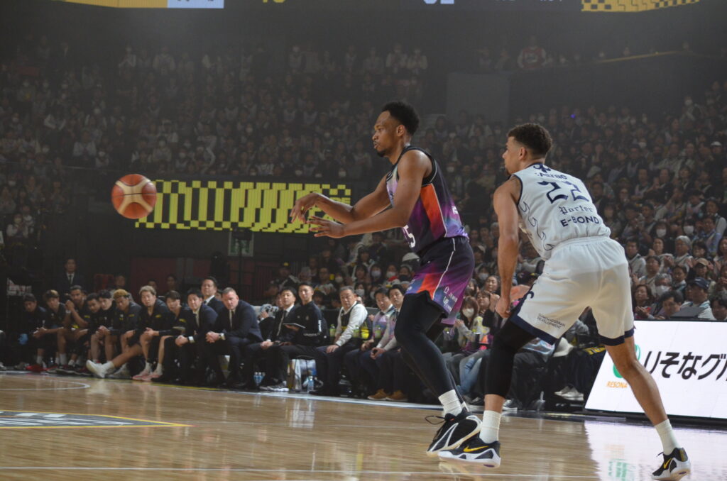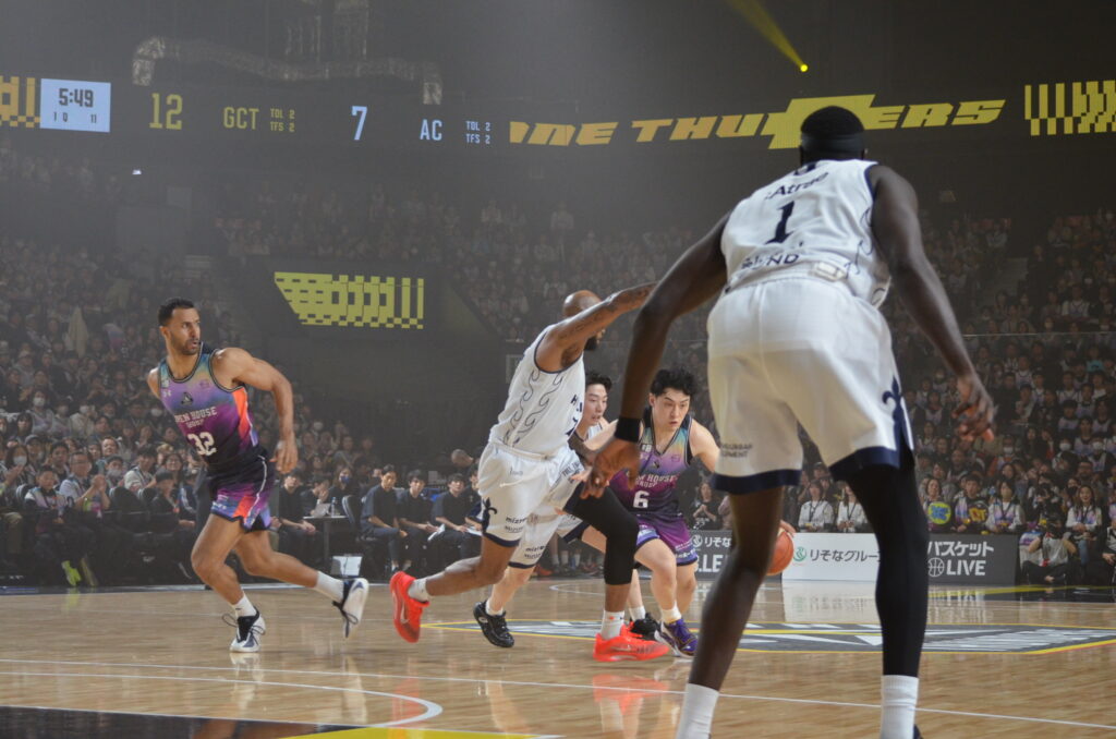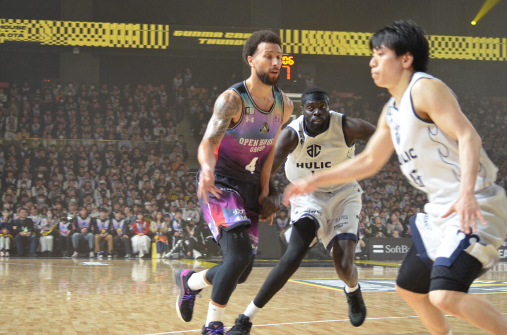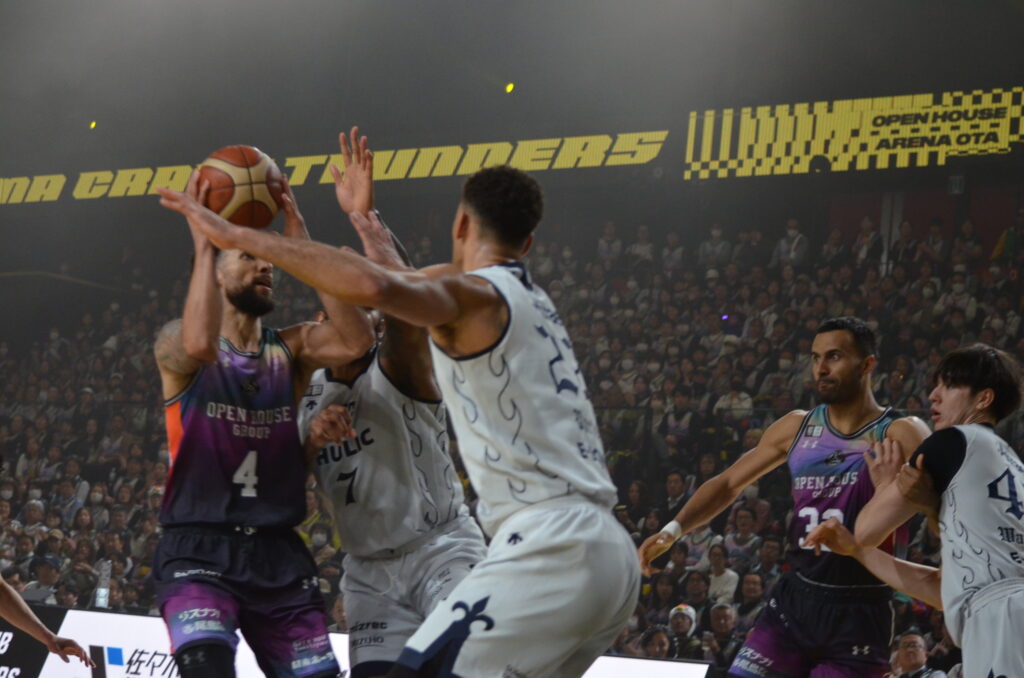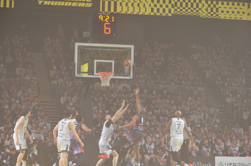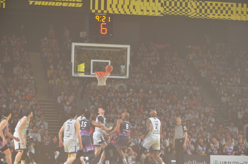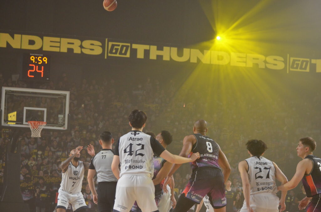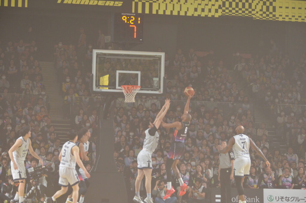 序盤から3点シュートの決定率が上がらず苦しい立ち上がりとなったが、サンダーズは持ち味の粘り強い守備でA千葉を翻弄。第1クォーターからSG細一輝の3点シュートやSFトレイ・ジョーンズのドライブなどでリードを奪うと、後半も強度を緩めず、相手のターンオーバーを誘発。最終的には25点差をつける快勝で、通算成績を31勝16敗とした。