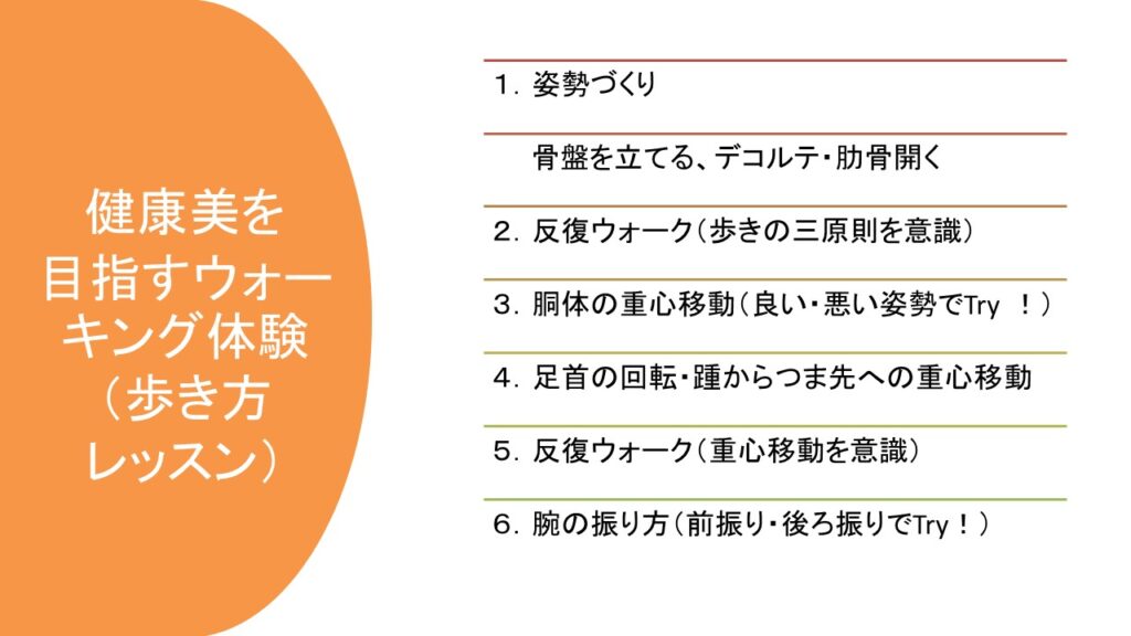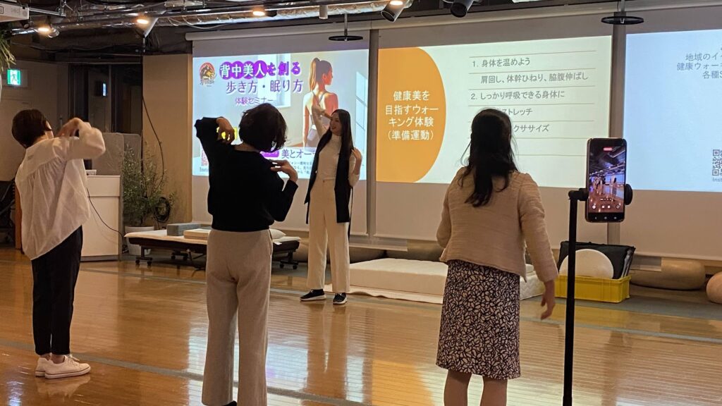 正しい姿勢と歩き方を実践しながら、肩甲骨や骨盤の動きを意識した美しい歩き方を紹介しました。