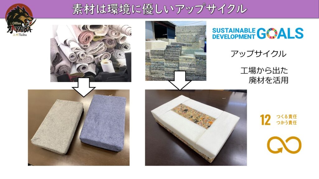 生地も中材も廃棄素材を再利用することで、持続可能なモノづくりを実現しています。