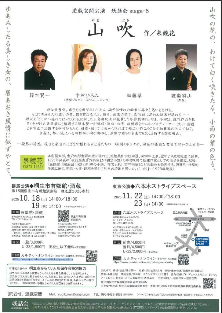 『高野聖』、『夜叉が池』『天守物語』など、妖しく美しい幻想的な世界を描いた作品が読者を惹きつける泉鏡花。そんな鏡花を「どこかへ連れて行ってくれる」と評した三島由紀夫が絶賛した名作戯曲『山吹』を上演します。鏡花作品を数多く手がけ古典芸能にも精通する篠本賢一さんが構成・演出・出演、前橋市を中心にプロデューサー・演出・俳優と多方面に活躍する中村ひろみさんと、俳優・語りで古典から現代まで幅広い作品をこなす加藤翠さんの三人で紡ぎます。音楽は、都山流尺八を川村泰山師に師事し、演劇や語りの音楽でも広く活躍する設楽瞬山さんが担当します。公演では役者が台本を持って出演しているので、日頃余り演劇を観ない人にとっても観やすいものになっています。会場となる桐生市有鄰館・酒蔵は、不思議な世界としての泉鏡花の作品を演じるのには最高のシチュエーションです。今回の公演は、東京の演劇ユニットから群馬在住の役者へのオファーで実現しました。
