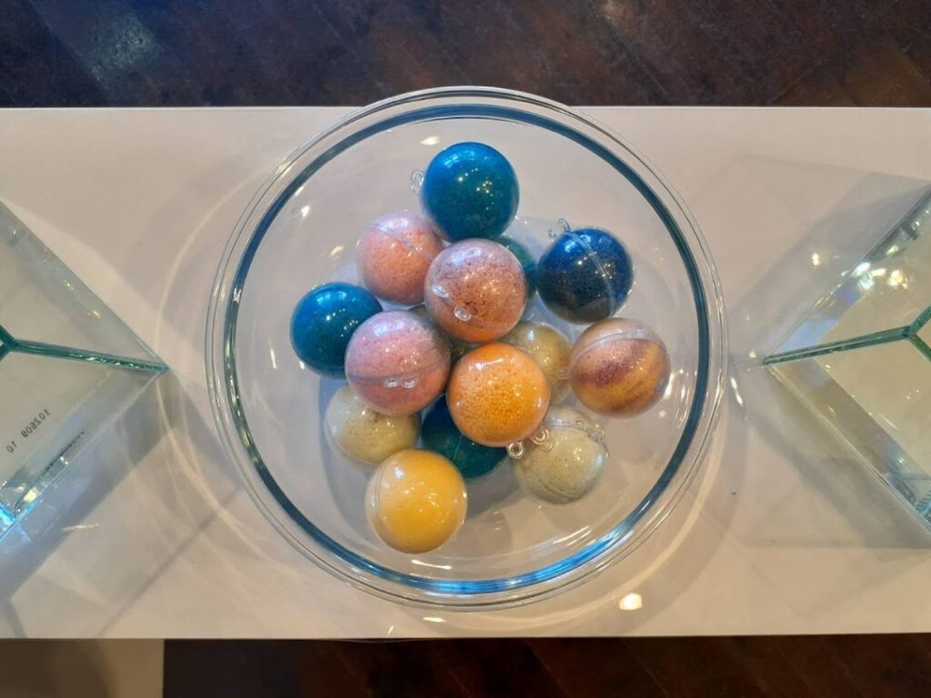 バスボールを使った今作《おもい玉》は、鑑賞者が心引かれるバスボールを自分自身で選び、水槽のなかでそれを溶かすと中からメッセージが書かれた紙が出てきます。自分よりも先に訪れた鑑賞者のメッセージを受け取った後、今度は自分自身が次なる鑑賞者へメッセージを残します。どこの誰かも分からない、お互いの顔も知らない他者にだからこそ、打ち明けられる『おもい』があると私は感じてます。 僕の感情も、あなたの感情も、一人きりで行き先を見失いませんように。