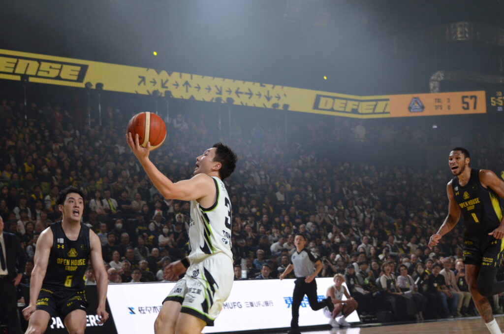 第2クオーター、19–16と接戦で迎えた場面。SG辻直人が2本連続で3ポイントを沈め、チームに勢いをもたらした。特に2本目は、粘り強い守備から速攻で決めた見事な一撃だった。
