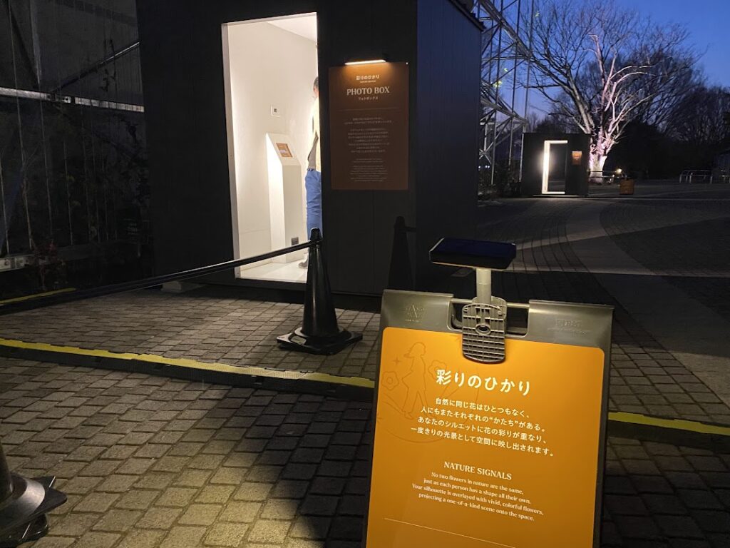なかでも印象に残ったのが、「彩りのひかり」の体験です。フォトボックスで撮影した自分のシルエットが、色とりどりの花と重なり合い、空間に投影される瞬間はとてもユニークでした。スクリーンの中に現れたのは、写真でも映像でもない、“その場でしか生まれない一枚”。自分自身が風景の一部になる感覚が、自然と心を解きほぐしてくれます。