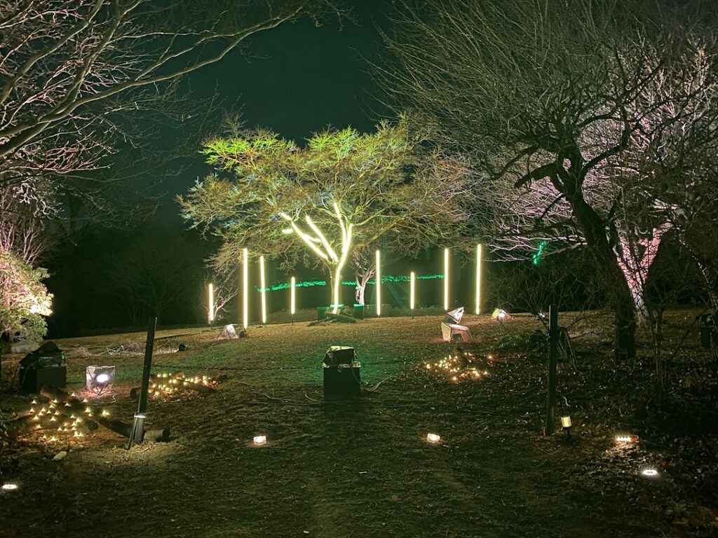 本イベントでは、単に光の量を増やすのではなく、園内の木々の形や地形、水といった自然そのものを活かす演出が重視されている。音の演出には、音楽プロデューサー・柿澤秀吉氏が実際に園内で録音した風や水の音が取り入れられており、視覚だけでなく聴覚からも「自然との共鳴」を感じられる構成となっている。